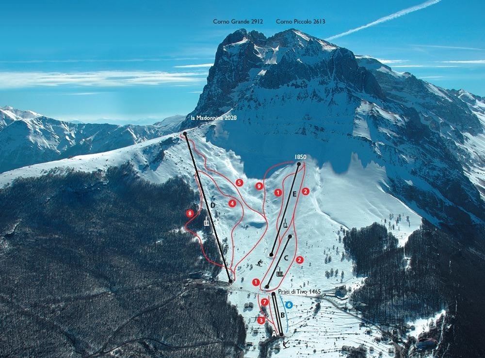 View the trails and lifts at Prati di Tivo with our interactive piste map of the ski resort. Plan out your day before heading to Prati di Tivo or navigate the mountain while you're at the resort with the latest Prati di Tivo piste maps. Click on the image below to see Prati di Tivo Piste Map in a high quality.