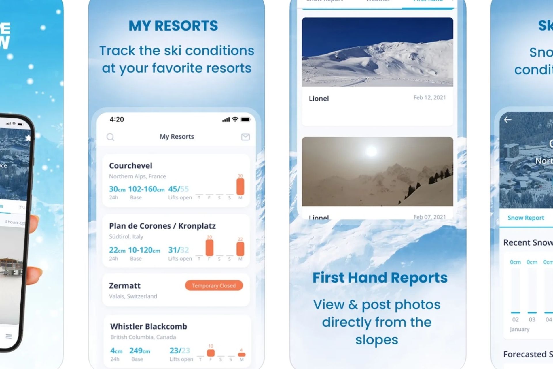 Recent enhancements include improved snow feed, search functionality, and snow depth percentages (showing how current depth compares to historical average).