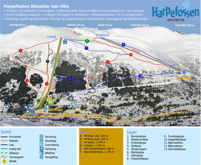 View the trails and lifts at Harpefossen with our interactive piste map of the ski resort. Plan out your day before heading to Harpefossen or navigate the mountain while you're at the resort with the latest Harpefossen piste maps. Click on the image below to see Harpefossen Piste Map in a high quality.